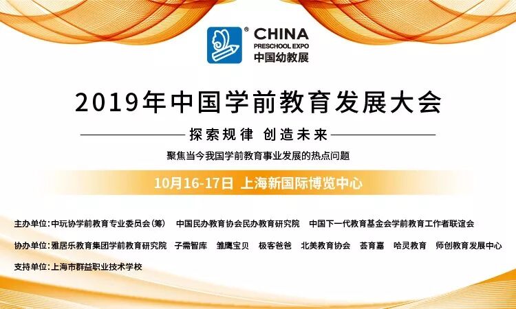 10月16-17日,由中玩協(xié)學(xué)前教育專委會(籌)、中國民辦教育協(xié)會民辦教育研究院和中國下一代教育基金會學(xué)前教育工作者聯(lián)誼會聯(lián)合主辦,雅居樂教育集團學(xué)前教育研究院、子需智庫、雛鷹寶貝、極客爸爸、北美教育協(xié)會、薈育嘉、哈靈教育、師創(chuàng)教育發(fā)展中心協(xié)辦的2019年中國學(xué)前教育發(fā)展大會將在上海新國際博覽中心開幕。